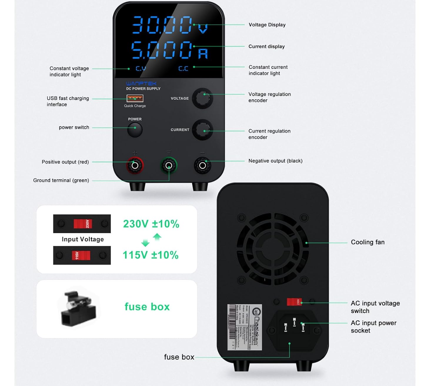 Program-Controlled encoder adjusts voltage and current with high precision & stability. Two group of four-digit digital display for Voltage & Current This Variable PSU is compact in size, light weight and high power density with high stability. USB fast charging interface with output power of 18W, supports multiple fast charging protocols. Output Display resolution: Voltage 0.01V, Current 0.001A. Temperature controlled cooling fan with low noise & long life.