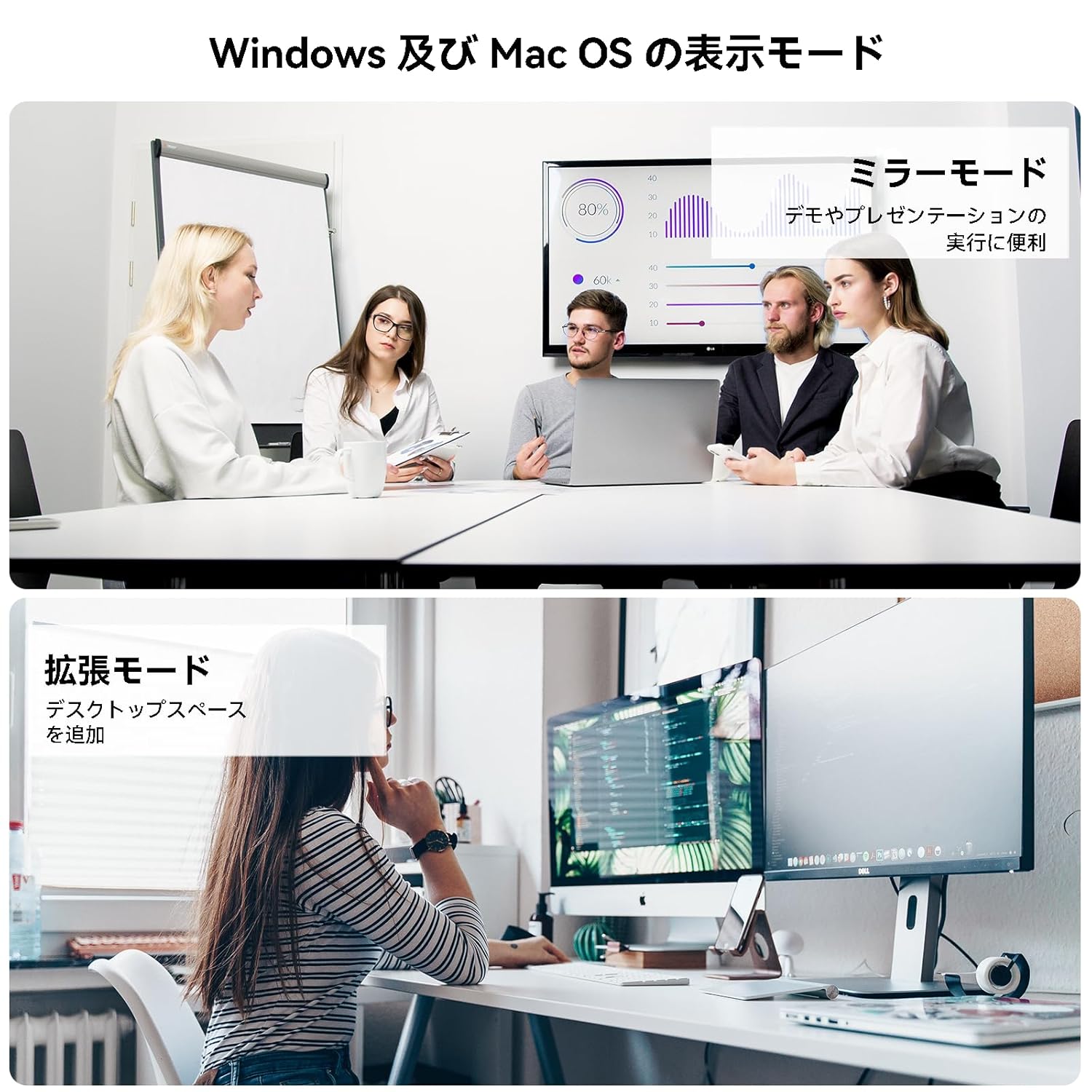 Supports four display modes including extension, synchronized, rotation and switching from main screen. HDMI cable, extensible USB connectivity to any HDMI Displays or projectors.