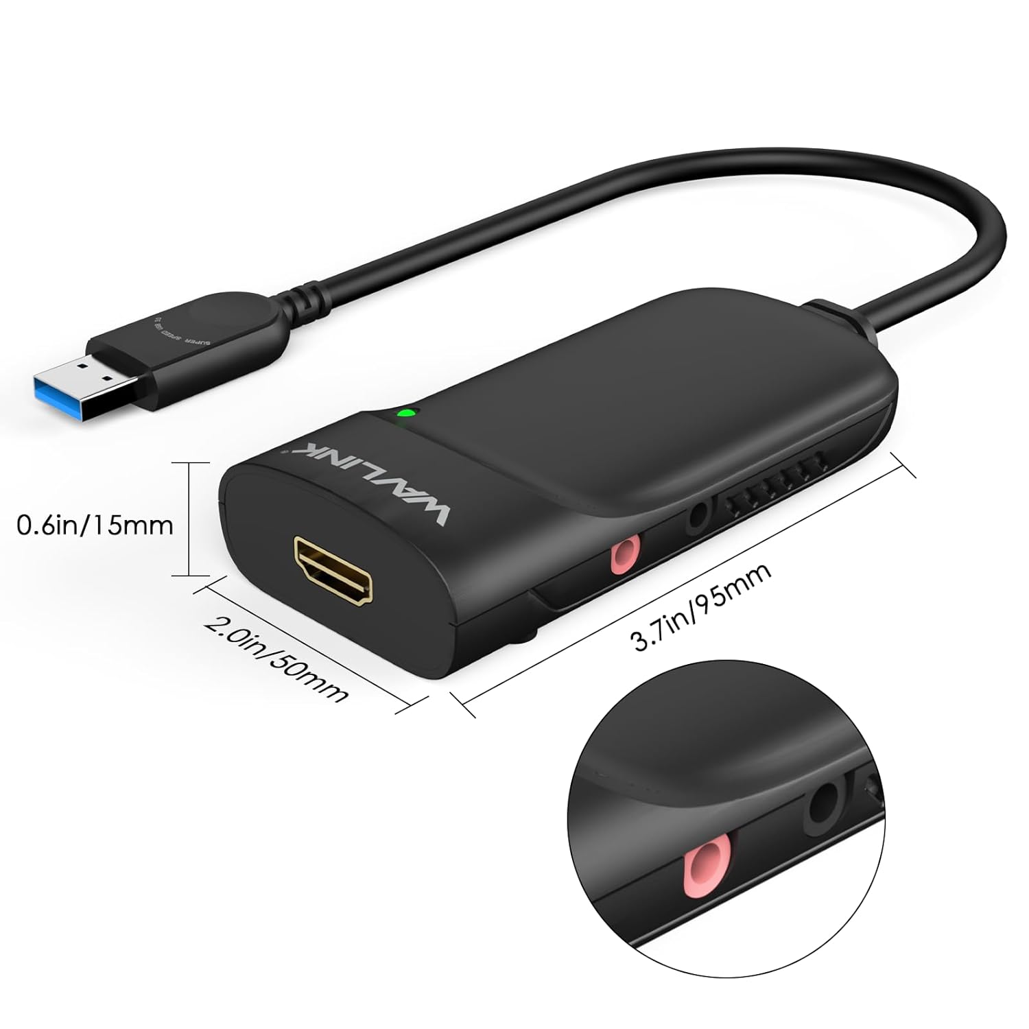 Model WL-UG3501H Ports 1x HDMI, 1× Earphone, 1×Microphone Unit Size 9.5 x 5.0 x 1.5cm/ 3.7 x 2.0 x 0.6in(L x W x H) Unit Weight 30g/1.1oz Housing Material ABS Shell Color Black