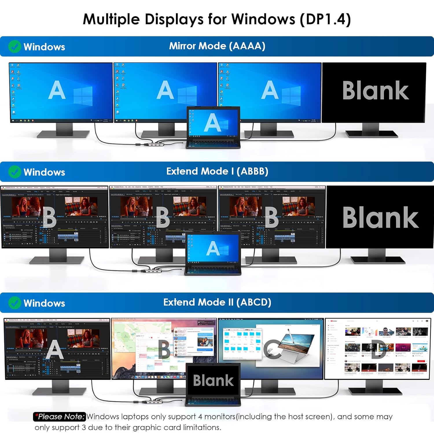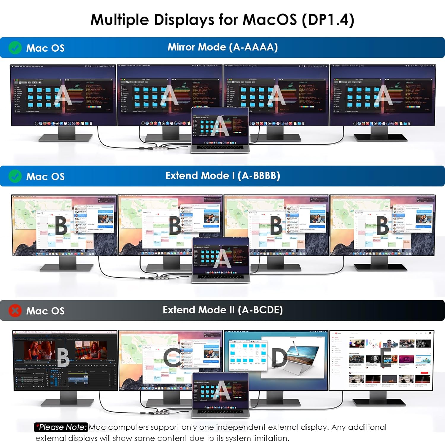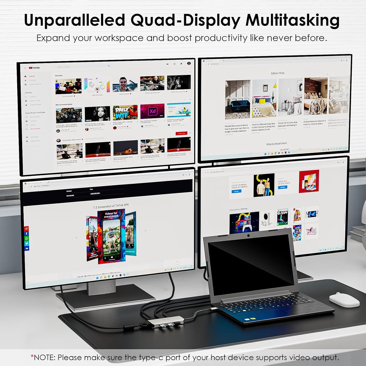 【⭐Quad Display Empowers Work】 Connect up to four monitors with 1080P@60Hz using 2DP, HDMI, and VGA ports (under DP1.4), which is perfect for multitasking and expanding your workspace. Imagine having multiple screens at your disposal, allowing you to have different applications, documents, or browser tabs open simultaneously. *Please Note: Windows laptops support up to 4 monitors (including the host screen); macOS-based computers only support one external display with different content.