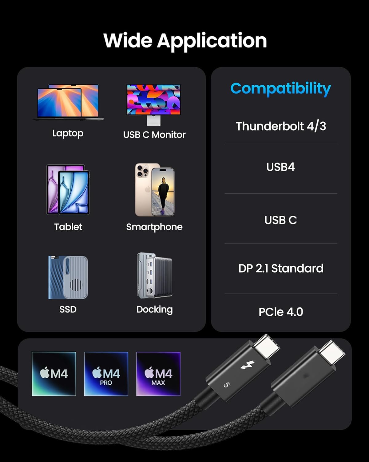 Universal Compatibility: Designed for versatility, this Thunderbolt 5 cable seamlessly connects with a wide range of devices, including all Thunderbolt 3, Thunderbolt 4, USB4, and USB-C equipment. Whether you are connecting to the latest laptops, docking stations, or high-resolution displays, this cable ensures you can build a flexible and efficient workspace with widespread compatibility.