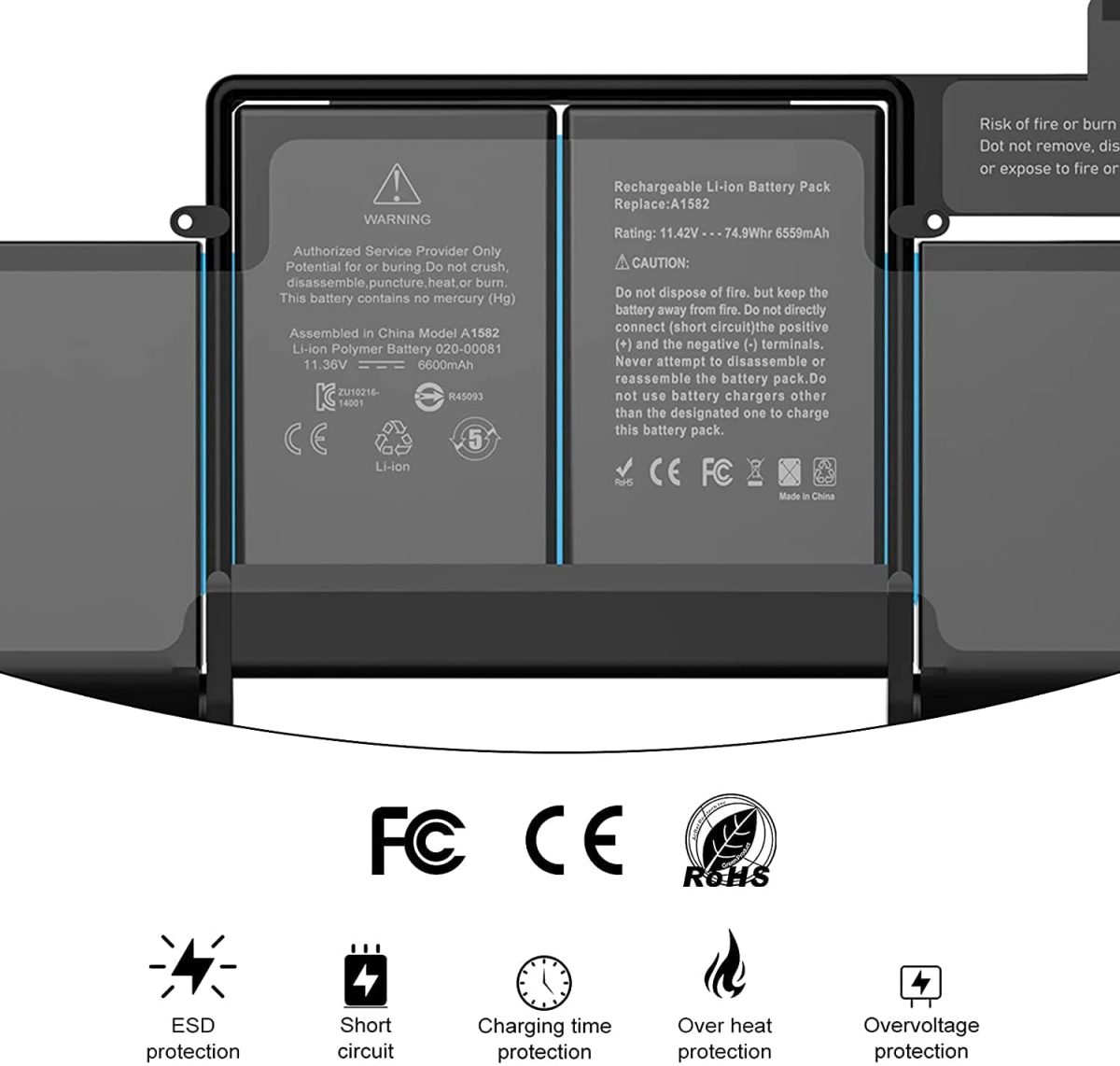 A1582 Battery inform:Material:Lithium polymer;Quality:335g ;Capcity:11.42V,6559mah,74.9Wh(If you are not sure whether the A1582 battery is suitable for your computer, please contact us before purchasing.)