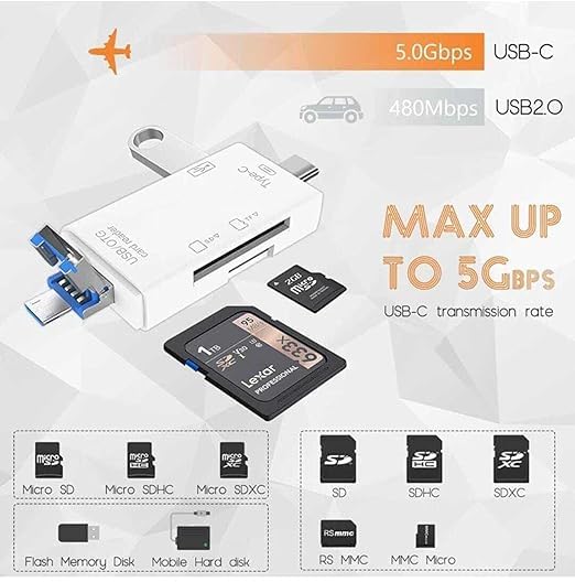 Transfer rate of up to 5 GbpsCompatible with OS: Windows, Mac OS, Linux and etc.SD slot: SD, SDHC, SDXC, RS-MMC, MMCMicro SD slot: Micro SD, Micro SDHC, Micro SDXCSize: L73.7xW21.5XH11.6 (mm)