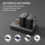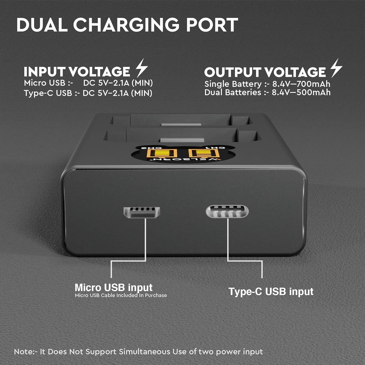Fully charges 1 battery in 2hrs and 2 batteries simultaneously in 3hrs with a 5V/2.1A input