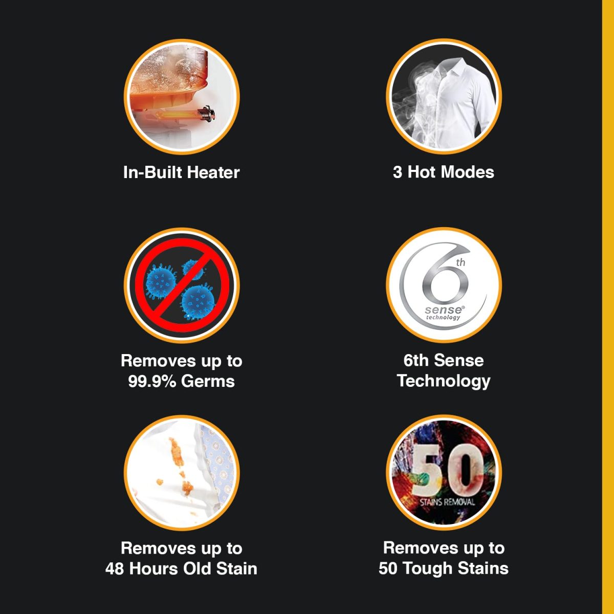 Heats water through a 6 step process to carefully and thoroughly remove upto 50 tough stains like ketchup, oil, grass, etc