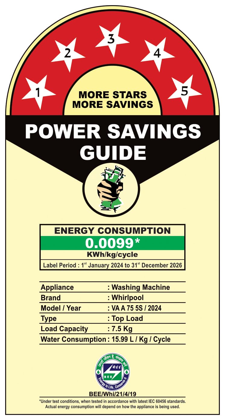 Fully Automatic top load washing machine : Affordable with best wash quality and easy to use with In-Built Heater Capacity:7.5 kg (Suitable for Small to Medium sized family) Energy Rating 5 Star: Best in class efficiency | Energy consumption – 0.0099* KWh/kg/cycle (Please refer BEE label for more information), Model/Year : VA A 75 5S/2024 Special Feature : In-built heater, Removes Up To 50 Tough Stains, 3 Hot Water Modes, Removes Up To 48 Hour Old Stains Additional Features: Hard Water Wash Program, ZPF Technology, Express Wash, Delay Wash, Auto Tub Clean, Spiro Wash In Box : Washing Machine, Inlet Pipe, Detergent Cup, Rat Mesh, Drain Pipe, Drain Hose with Clamp Drum / Pulsator type & Body material: Stainless Steel Warranty : 2 Years Comprehensive Warranty and 10 years additional warranty on Motor & Prime Mover (Brand Warranty can be availed using amazon invoice) Max 740 RPM – higher spin speeds helps in faster drying Product Dimensions: 58D x 54W x 101H Centimeters