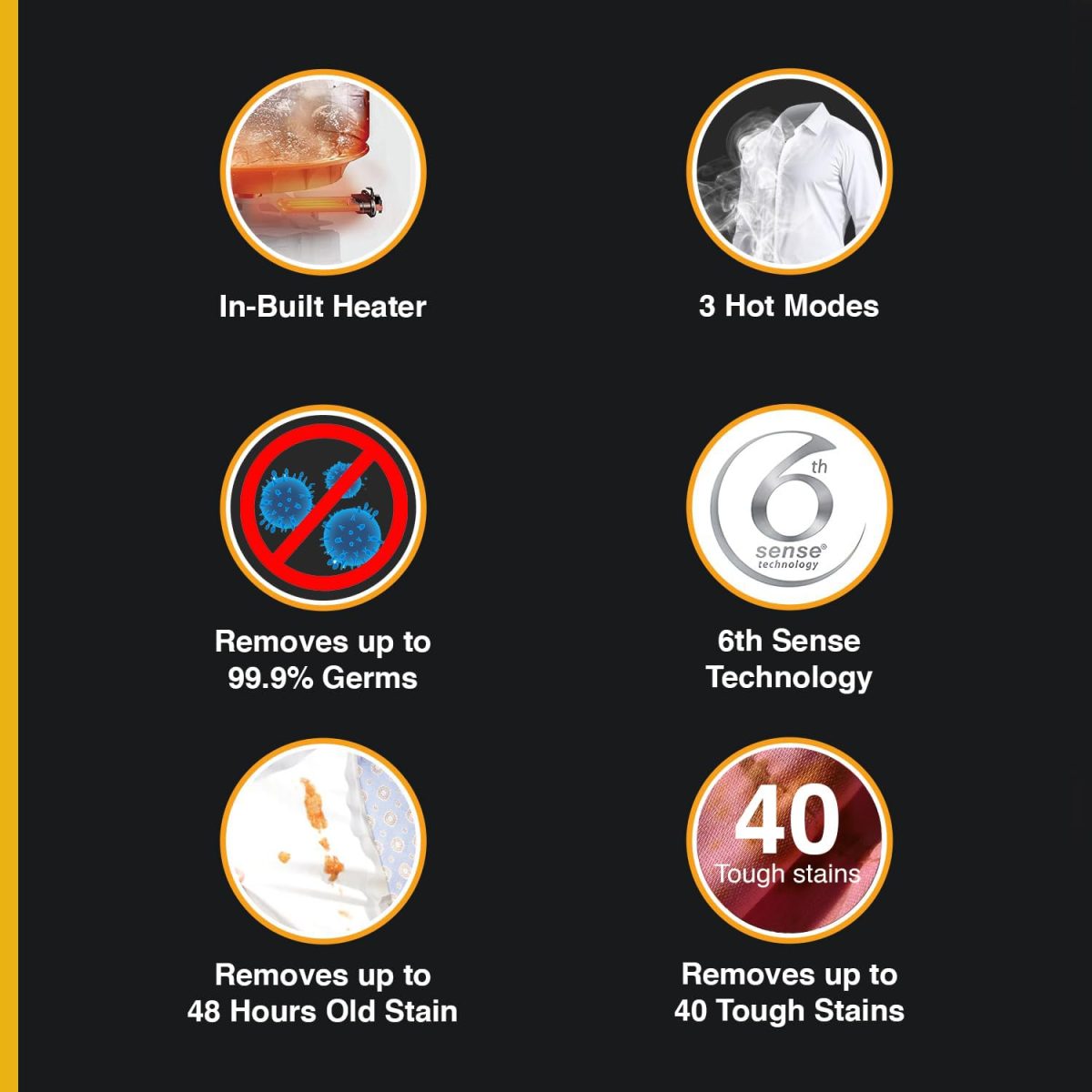 Heats water through a 6 step process to carefully and thoroughly remove upto 50 tough stains like ketchup, oil, grass, etc