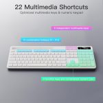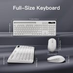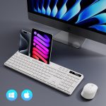 Full-size wireless keyboard with a 8.7″ phone and tablet holder. Provides you with extra space to place your phone, tablet, or other gadgets. Keeps your phone within easy reach for charging, reading.