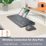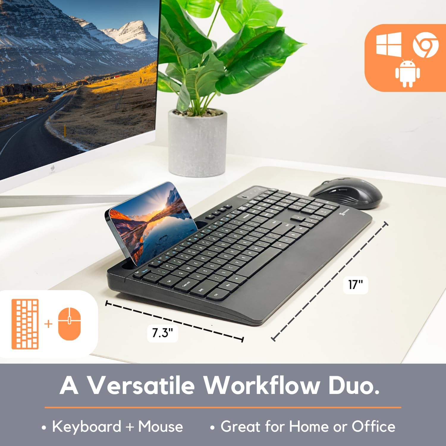 (Integrated 8″ Stand): Simply slot your tablet, smartphone, or both into the integrated stand of our wireless keyboard mouse combo and stay productive on-the-go.
