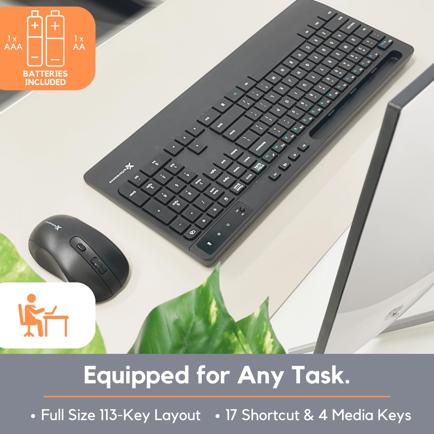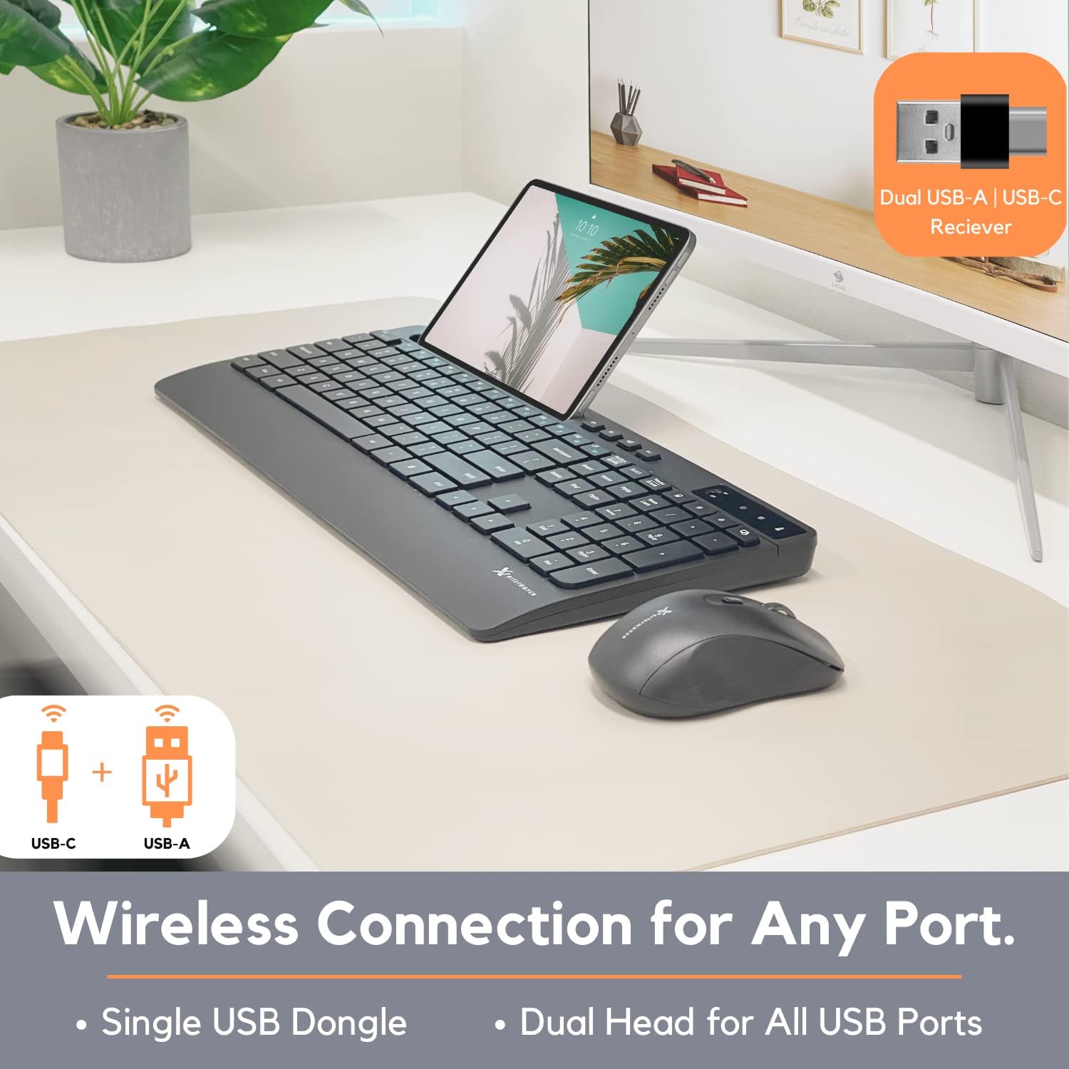 Unleash Your Productivity with the Ultimate Wireless Keyboard and Mouse Combo Transform your workspace with the X9RACDOCKCB, a versatile wireless keyboard and mouse combo designed for seamless productivity. Whether you’re working on a PC, Android, or Chrome device, this keyboard and mouse combo has all the features to streamline your workflow, offering an unparalleled typing and navigation experience. Key Features: Dual Wireless Connectivity: The combo features a unique dual RF dongle that is compatible with both USB-A and USB-C ports, ensuring you can connect to any device effortlessly. Enjoy the freedom of wireless connectivity with this 2.4GHz combo, ideal for any workspace. Versatile Device Stand: The integrated 8″ device slot on the keyboard is perfect for setting up your tablet or smartphone, making it easy to multitask and stay connected while working. Full-Size Keyboard: The 113-key layout includes 17 shortcuts and 4 media keys, providing a comprehensive typing experience. The adjustable kickstand allows you to customize the keyboard angle for maximum comfort. Ergonomic Mouse Design: The 6-button mouse features 3 DPI modes (800/1200/1600) for precise cursor control. Its ambidextrous design ensures comfortable use for both left and right-handed users. Convenience at Your Fingertips: The included batteries (AAA for the keyboard and AA for the mouse) mean you can start using this combo right out of the box. Product Specs: Keyboard Dimensions: 17″ x 7.3″ x 1.2″ Mouse Dimensions: 2.4″ x 4.7″ x 1.5″ Connectivity: 2.4GHz Wireless, Dual USB-A/USB-C RF Dongle Keyboard Layout: 113 Keys with 17 Shortcuts Mouse DPI Modes: 800/1200/1600 This keyboard and mouse wireless USB-C combo offers everything you need to boost your productivity, whether you’re at home or on the go. With its cordless design and universal compatibility, this combo is perfect for those seeking a high-quality wireless thin keyboard and mouse experience.