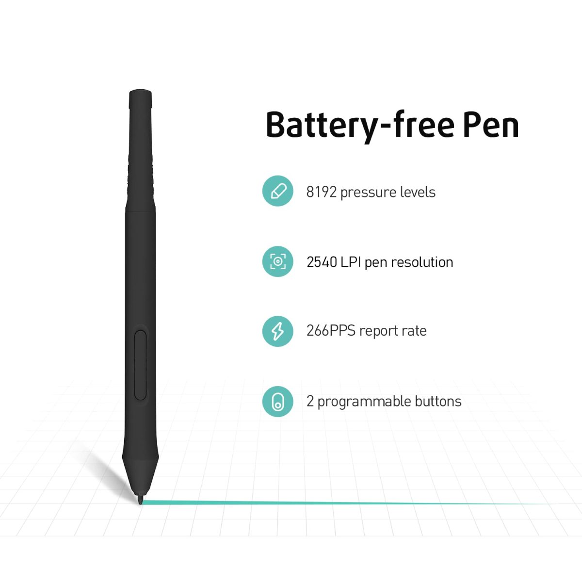 Our BATTERY-FREE PEN is enhanced by a HIGHLY PRECISE PRESSURE SENSOR which ultilizes 8192 level of pressure sensitivity. Two customizable side buttons allow you to put your favorable shortcuts on it.