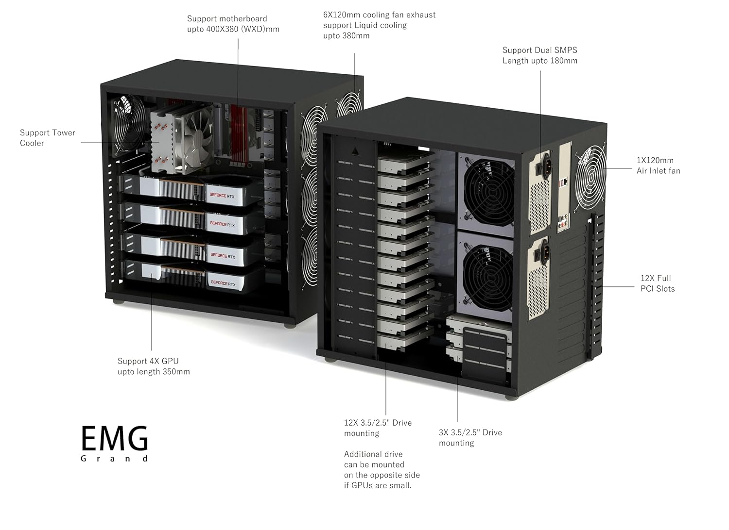 XtremeMiner Desktop Case Support Mini ITX, Micro ATX, ATX, E-ATX, SSI-CEB, SSI-EEB, SSI-MEB Motheboards, Dual SMPS and Upto 15 Drives and 4 Big GPU – Model – EMG V1