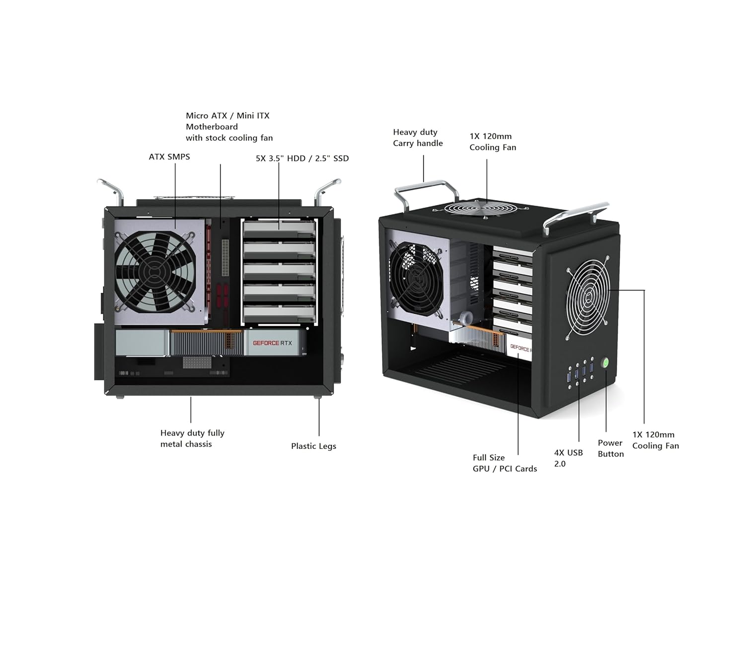 Support upto 5 HDD/SSD drives in a single chassis, you can make it as gaming PC, Storage Server, Professional System, Computing Server.
