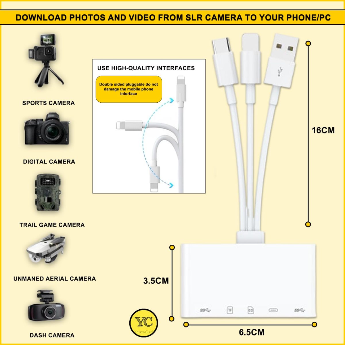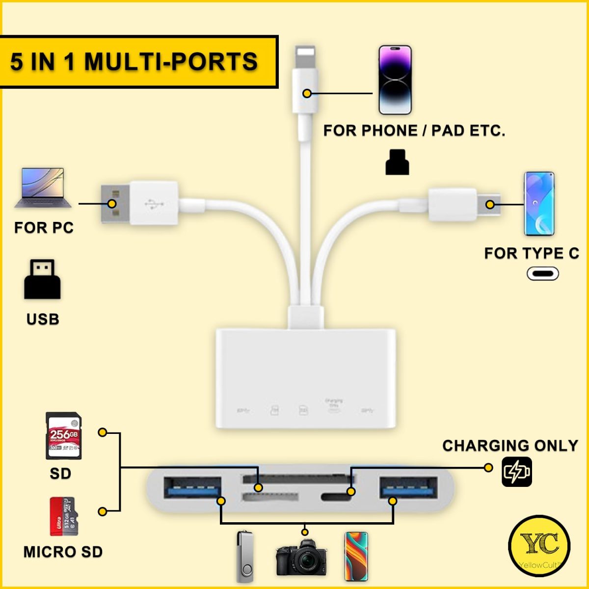 YellowCult 5-in-1 Universal Memory Card Reader – Fast & Versatile Data Transfer for iPhone, iPad, USB & USB-C Devices ✔ All-in-One Card Reader for Seamless Connectivity Effortlessly transfer and manage your files with the YellowCult 5-in-1 Memory Card Reader, designed for iPhone, iPad, USB, and USB-C devices. Featuring SD, Micro SD, SDHC, SDXC, and MMC memory card support, this universal OTG adapter is perfect for photographers, content creators, and professionals who need quick and reliable data access. ✔ High-Speed Data Transfer – Save Time & Boost Efficiency Experience ultra-fast file transfers with this advanced memory card reader. Whether you’re moving photos, videos, music, or documents, the USB 3.0 and USB-C connectors ensure lightning-fast speeds, making it ideal for professionals who demand efficiency. ✔ Plug & Play – No Apps or Drivers Required Forget the hassle of installing software—just plug and play! The YellowCult Memory Card Reader is designed for instant access without additional apps or drivers, providing a user-friendly, hassle-free experience. ✔ Universal Compatibility for Maximum Convenience Designed to work seamlessly with iPhone, iPad, MacBook, Android, Windows, and more, this multi-functional adapter allows you to easily connect memory cards to your laptop, smartphone, tablet, or other OTG-supported devices. ✔ Compact, Durable & Travel-Friendly Made with premium alloy casing, the YellowCult 5-in-1 Card Reader is lightweight, durable, and built for portability. Its sleek and compact design makes it perfect for on-the-go professionals, travelers, and everyday users. ✔ Why Choose YellowCult? 🔹 Best-Selling Brand Trusted for Performance & Durability 🔹 Universal Compatibility – Works with iOS, Android, Windows & Mac 🔹 Fast & Reliable Data Transfer – No Lag, No Delays 🔹 Sturdy & Compact Design – Built for Travel & Everyday Use 🔹 Exceptional Customer Support & Warranty for Peace of Mind Upgrade your file management experience with the YellowCult 5-in-1 Memory Card Reader—The ultimate solution for fast, secure, and effortless data transfers!