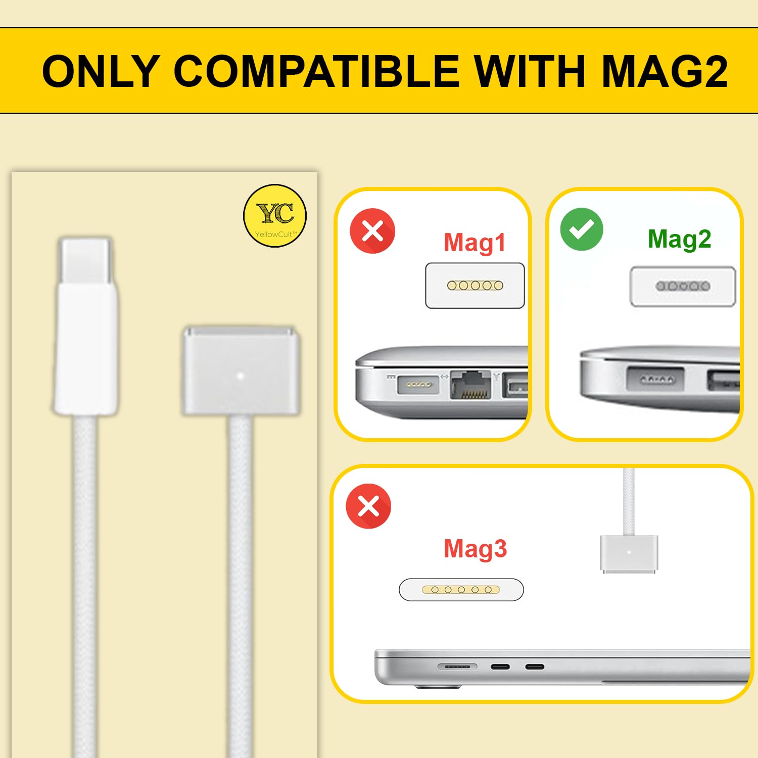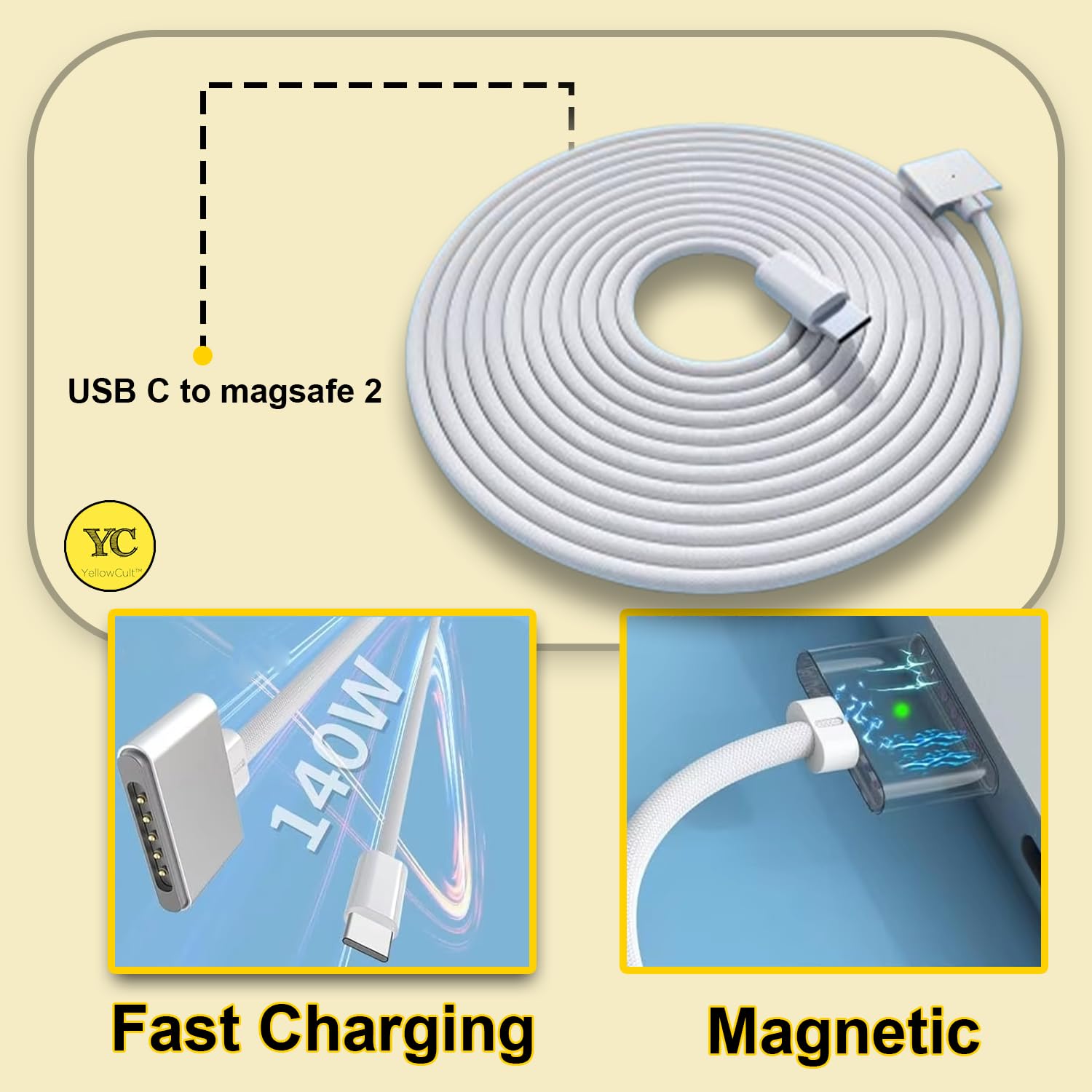 Power up your MacBook with ease and style using our USB-C to MagSafe Charger, a cutting-edge solution designed for seamless compatibility, exceptional performance, and long-lasting durability. Whether you’re working on the go, at home, or in the office, this charger is your perfect companion for fast and secure charging. Designed to work effortlessly with all MagSafe-compatible devices.The USB-C connection makes it versatile and future-proof, ensuring a reliable charging experience wherever you are. Experience lightning-fast charging speeds with our optimized power delivery system, so you can spend less time waiting and more time being productive. The secure magnetic connection ensures your device stays connected without risk of accidental disconnections. The MagSafe technology protects against wear and tear, providing peace of mind during use. Crafted with premium-grade materials, including reinforced connectors and a tangle-resistant cable, this charger is engineered to withstand the rigors of daily use without compromising performance. Sleek and lightweight, the USB-C to MagSafe Charger fits easily into your bag or pocket, making it an ideal choice for professionals, students, and travelers alike. Why Choose Us? At YellowCult, we pride ourselves on combining innovation, quality, and customer satisfaction. Every product is meticulously tested to meet the highest standards of durability, safety, and performance. Our commitment to excellence is reflected in every detail, from the ergonomic design to the eco-friendly packaging. We are dedicated to reducing environmental impact through sustainable sourcing and responsible production practices. Your satisfaction is our priority. We offer hassle-free service , a robust warranty, and support to ensure your peace of mind.Upgrade your charging experience with the USB-C to MagSafe Charger and enjoy the perfect blend of style, functionality, and reliability. Add it to your cart now and experience the difference!