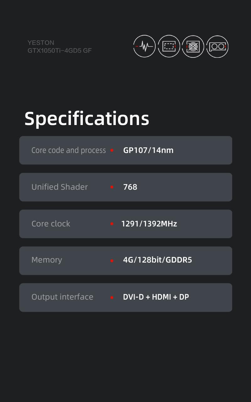 Core code and process: GP107/14nm Unified shaders: 768 Core frequency: 1291/1392MHz Memory frequency: 1752MHz Memory speed: 7Gbps Memory capacity and specifications: 4G/128bit/GDDR5 3D features: DirectX 12/DSR/GameStream/G-Sync/OpenGL 4.5/8K OS Features: Windows 7/8/10/11 Bus interface: PCI-Express 3.0 x 16 Output interface: DVI-D+HDMI+DP