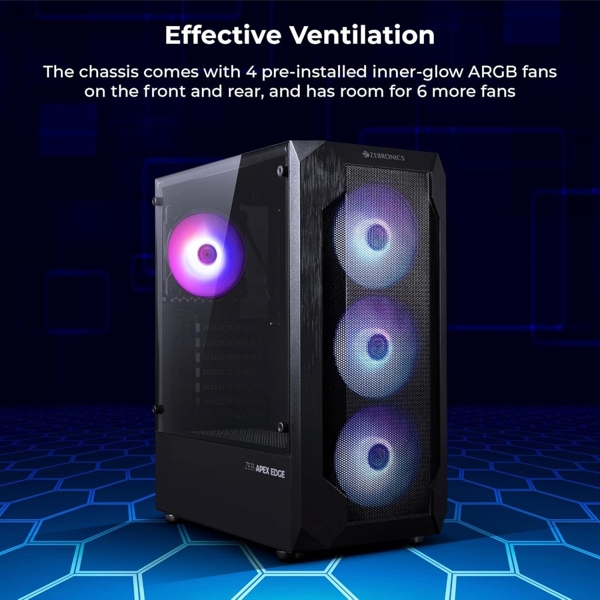 ZEBRONICS APEX Edge Premium Mesh Gaming Cabinet/Case, Full-Tower, Supports E-ATX | ATX | mATX | ITX, AIO Upto 360mm, 4X Inner Glow ARGB Fans, Tempered Glass, USB 3.0, Magnetic Dust Filter