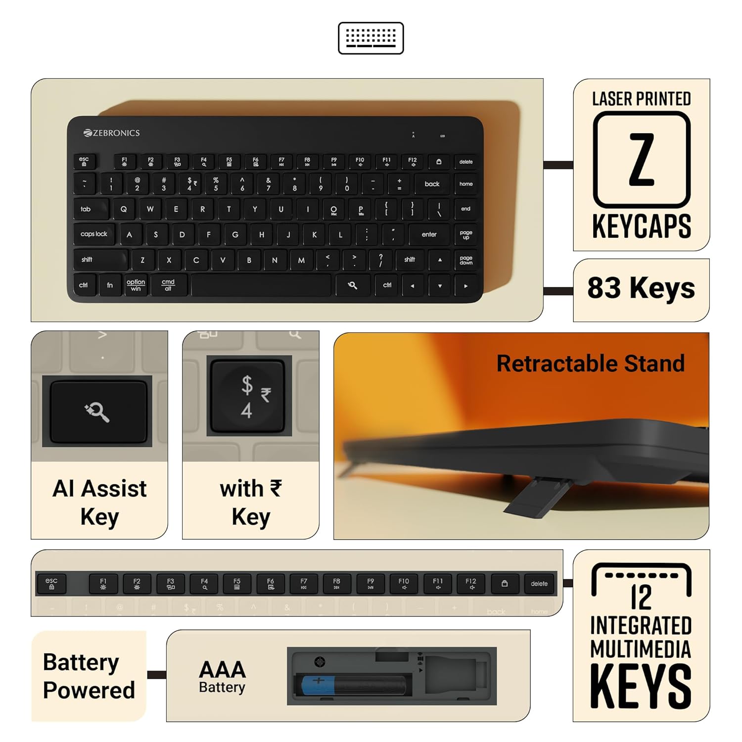 Keys: The keyboard is equipped with 83 keys including a Rupee key (₹), catering to users in regions using the Indian Rupee currency.