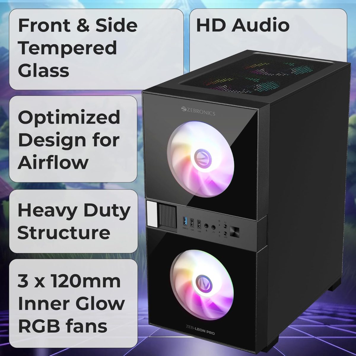 ZEBRONICS Leon PRO Premium Gaming Cabinet/Case, Mini-Tower, Supports mATX | ITX, 3 Pre-Installed RGB Fans, Side Tempered Glass, USB 3.0, Magnetic Dust Filter (Black)