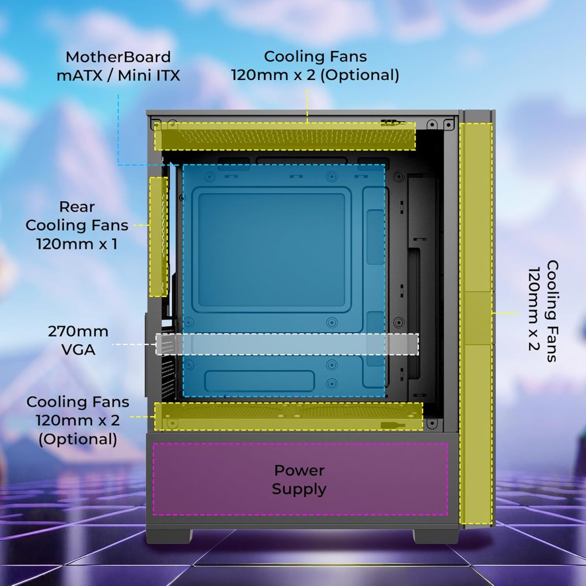 Motherboard Support: Elevate your gaming setup with this chassis, designed to support both mini ITX and mATX motherboards