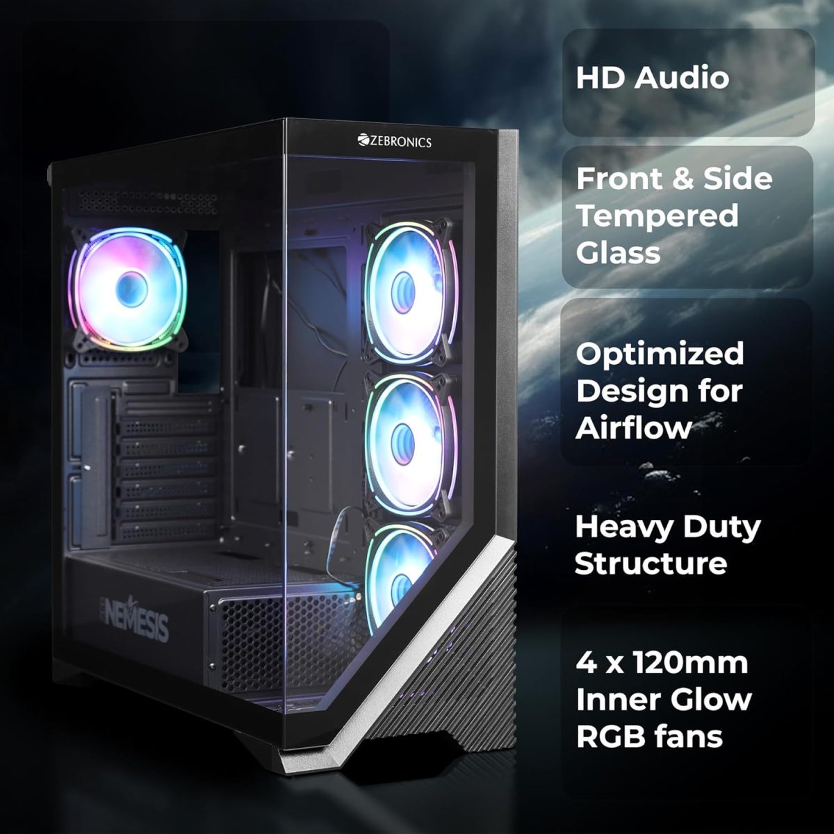 ZEBRONICS Nemesis Premium Gaming Cabinet/Case, Mid-Tower, Supports ATX | mATX, 4X Center Infinity ARGB Fans, AIO Upto 360mm, LED Control Switch, Front + Side Tempered Glass, USB 3.0 (Black)