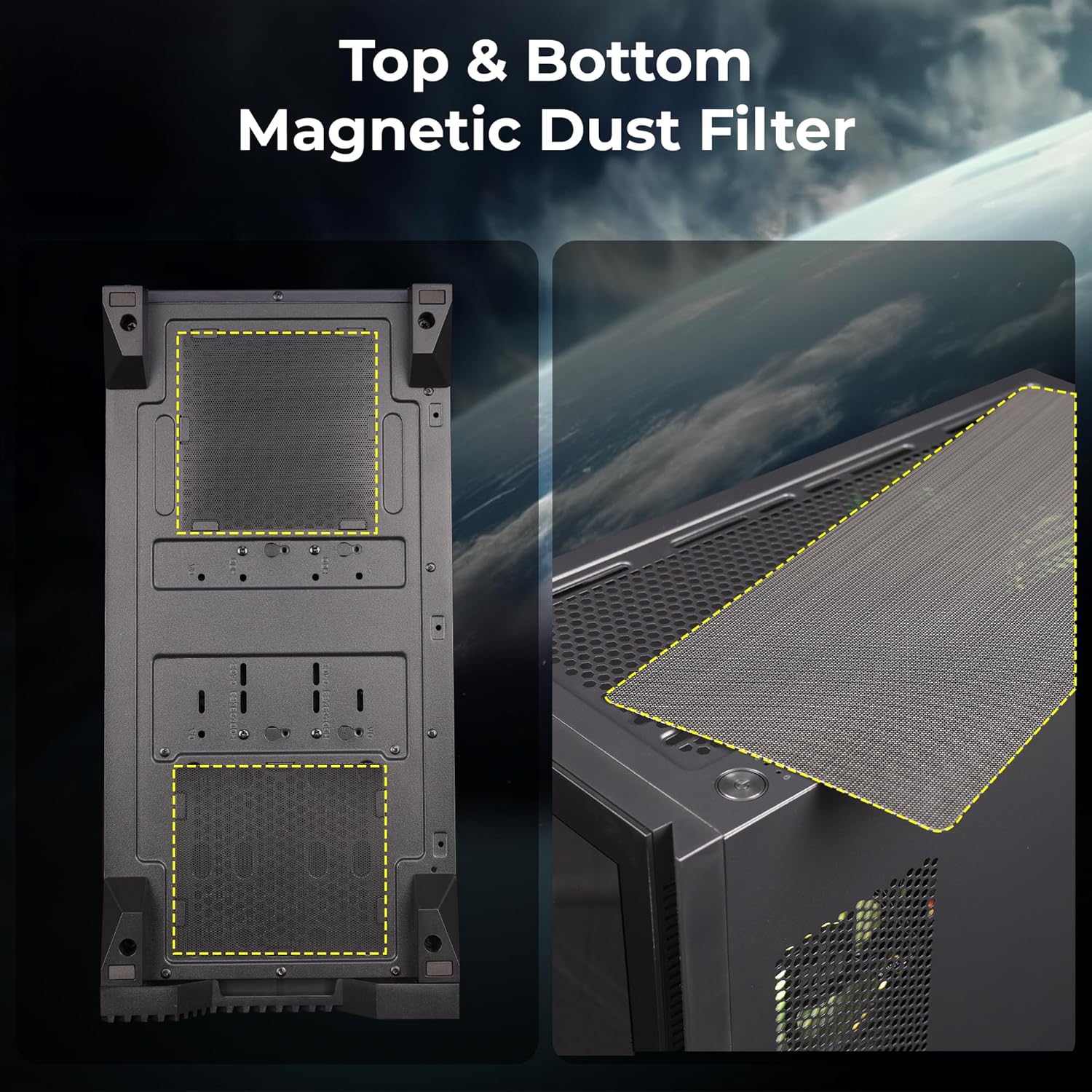 Magnetic dust filter: This chassis includes a top magnetic and bottom dust filter to efficiently prevent dust buildup on the fans.