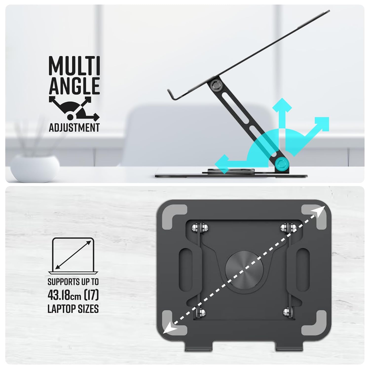 360° Rotatable Design: The laptop stand features a 360° rotatable design, offering unparalleled flexibility, allowing you to effortlessly adjust the orientation of your device, making it ideal for collaborative work environments.