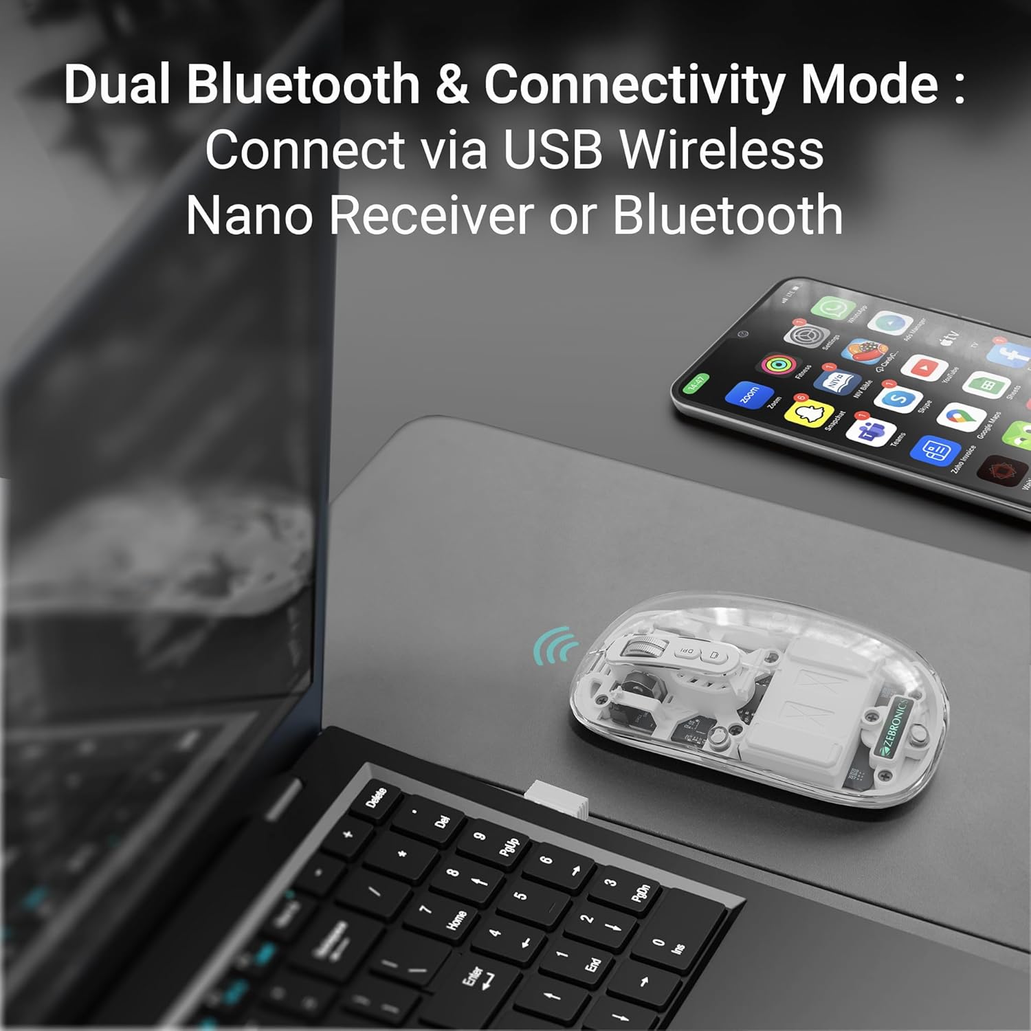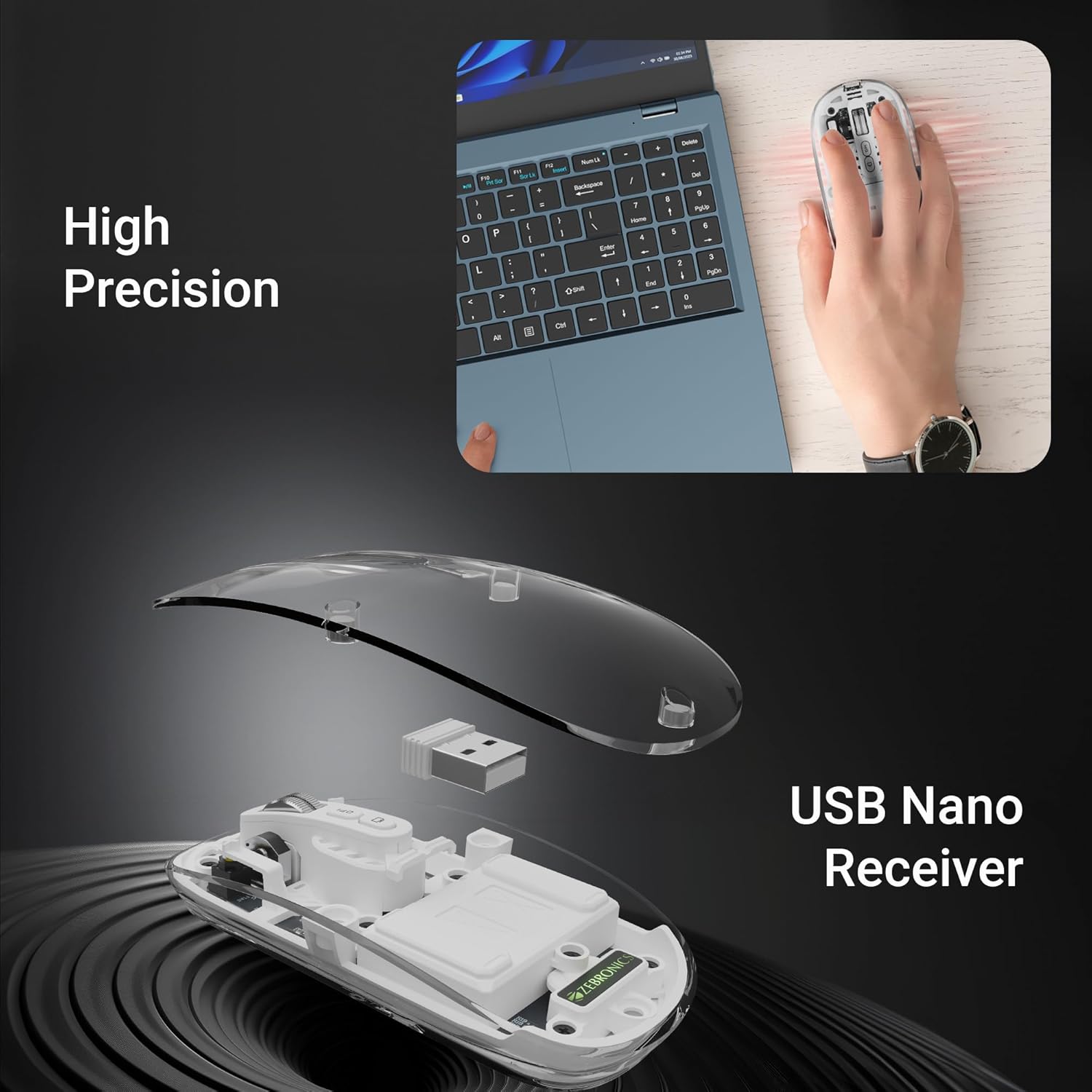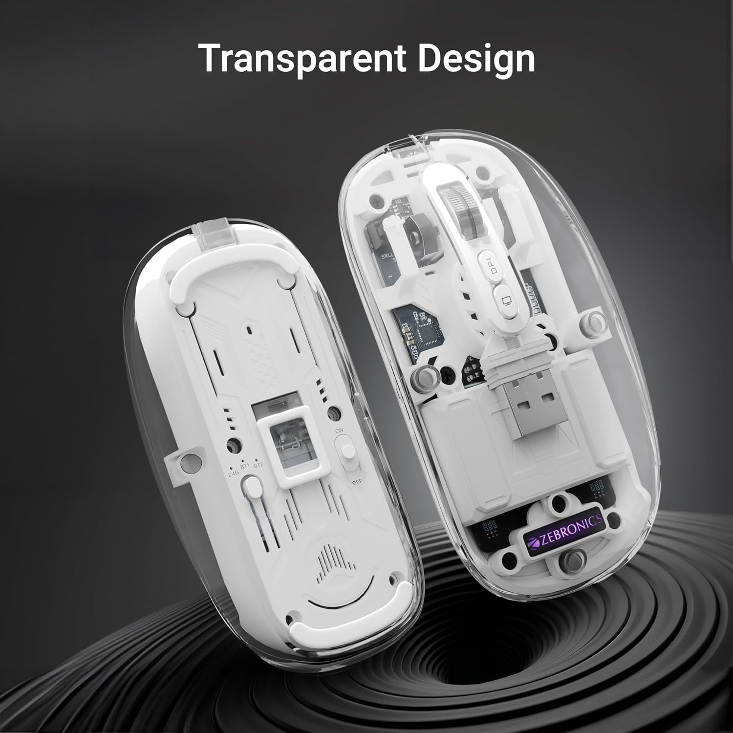 ZEBRONICS Sheer Rechargeable Wireless Mouse, Dual Mode (2.4GHz + BT), Dual Bluetooth, Silent Operation, Transparent Body, RGB, Battery Indicator, for Mac | Laptop | Computer (White)
