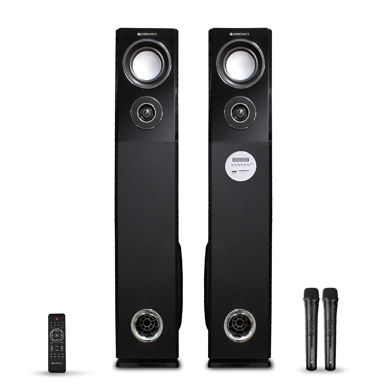 Features 2.0 channel Tower speaker Wireless BT/USB/SD/FM/AUX LED display 2 x 20.32cm Subwoofer 3 way speaker Remote control Karaoke Dual microphone input jacks