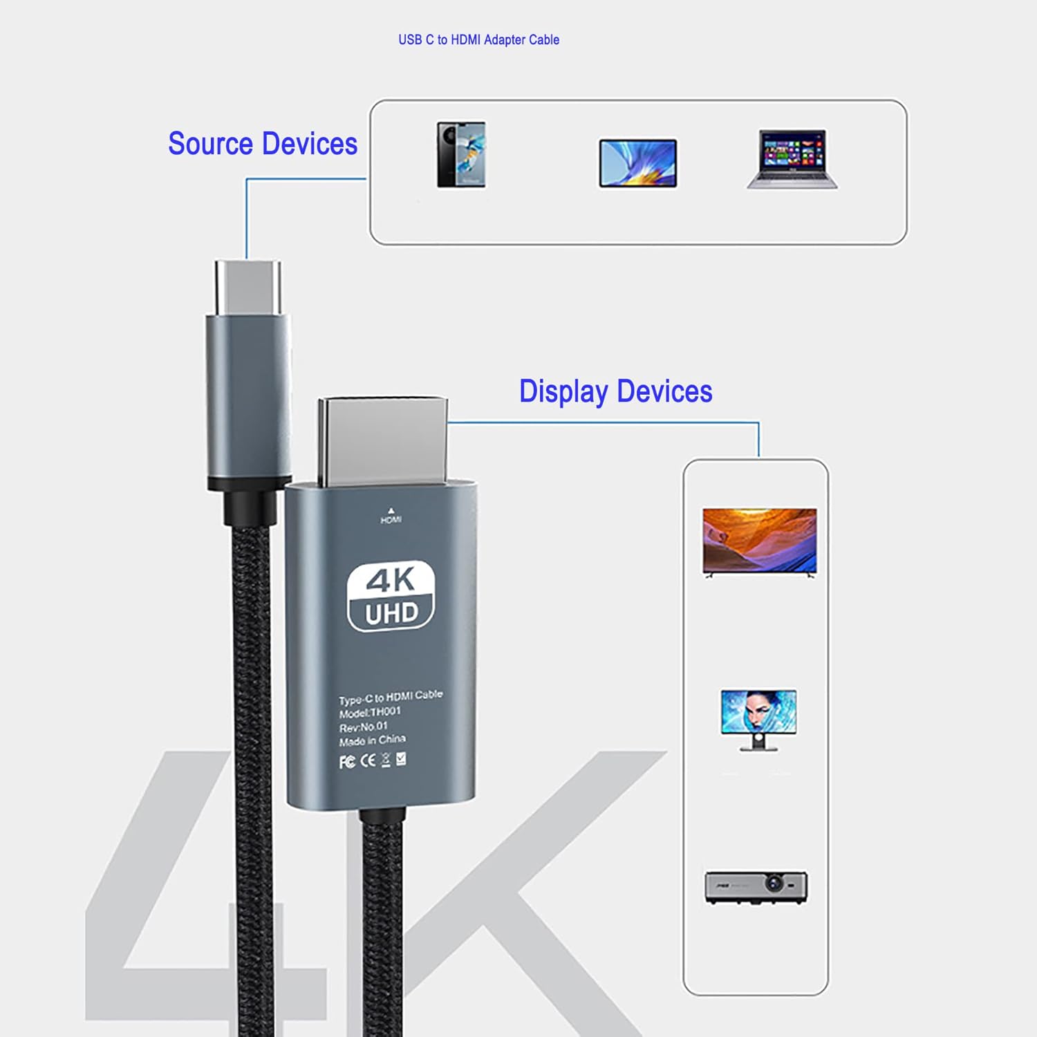 This USB type c to HDMI cable is braided and durable. The threaded USB-C to HDMI cable supports high resolution 4K@60Hz. This cable and adapter enables to connect your Thunderbolt 3 and 4 devices such as tablets / smartphones / laptops to HDMI display or HDTV. It can duplicate, extend your display and charge your phone or computer. It suppports Dolby and HDCP. It is also compatible with Roku TV/HDTV/Blu-ray. It is real plug and play with DP Alt Mode enabled USB-C smartphones,tablets, notebooks and an ideal accessory for all Apple products with Thunderbolt 3 or 4 feature as well as other brands. It works with iPhone 15 Pro.