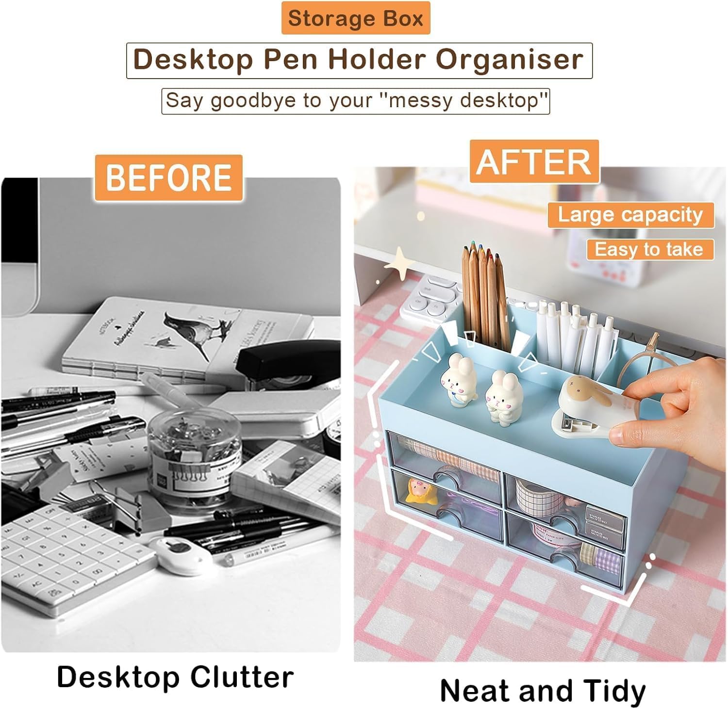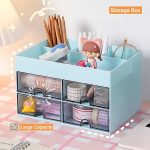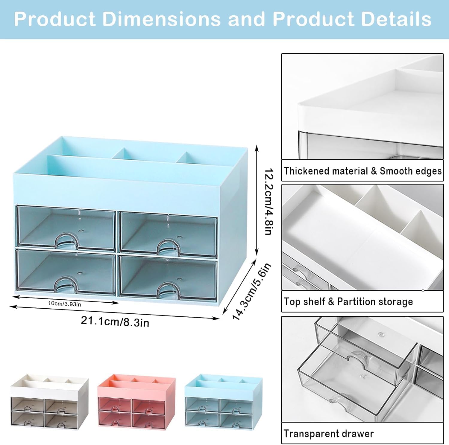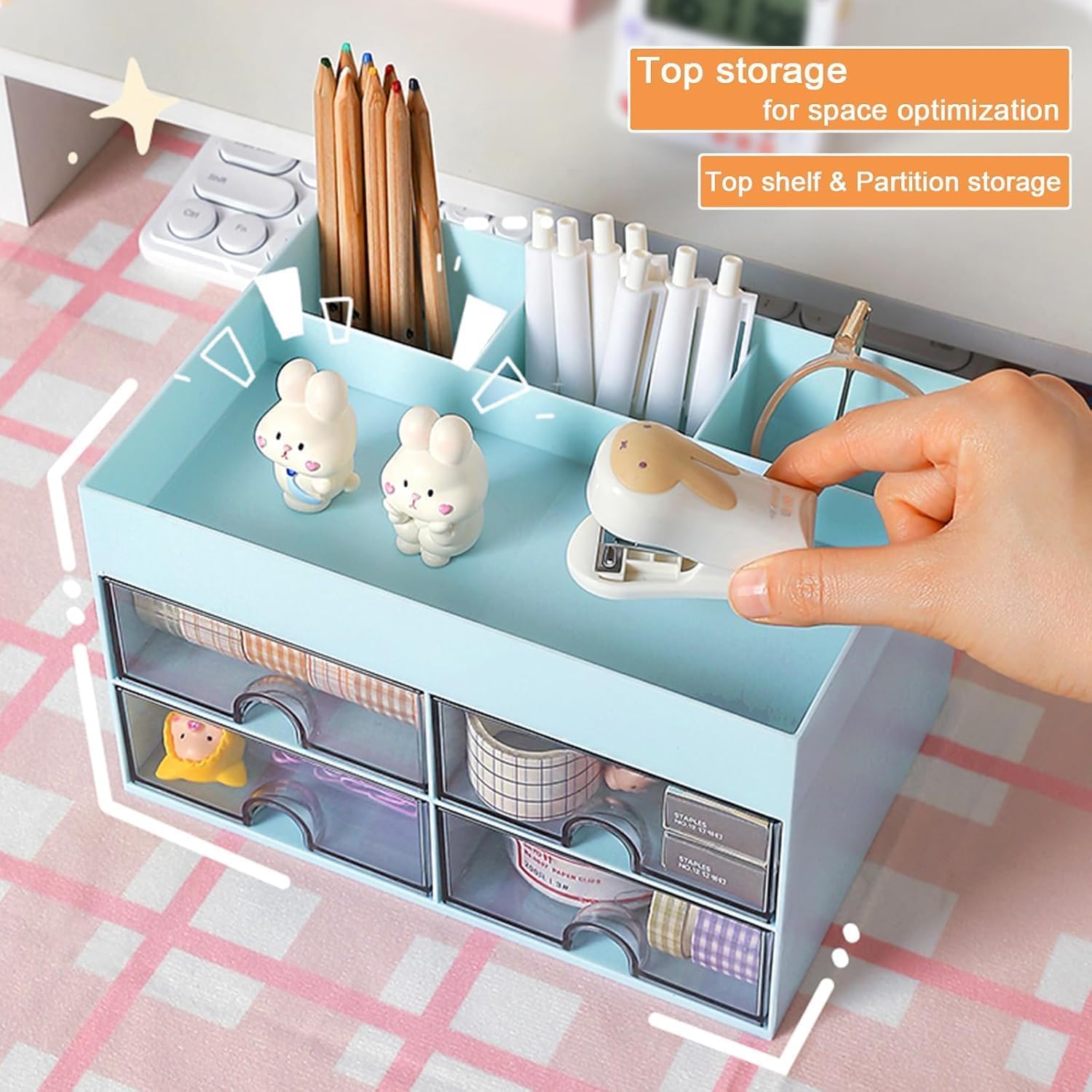 Zollyss Plastic Multi-Functional Desk Organizer With 4 Compartments & 4 Drawer Desktop Office Supplies Stationery Storage Box Cosmetic Organizer For Pens Staplers Clips Sticky Notes (Blue)