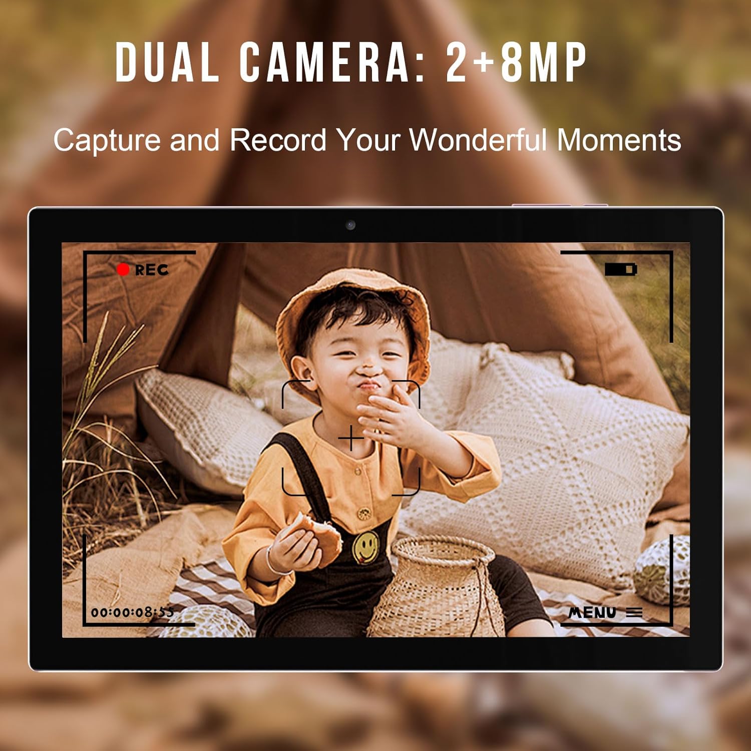 【HD Dual Camera, Capture Exciting Moments】 Tablet PC with 10 inch, equipped with an 8MP rear camera, autofocus and flash, shooting clearly during day and night. 2PM front camera provides excellent clarity during video calls.